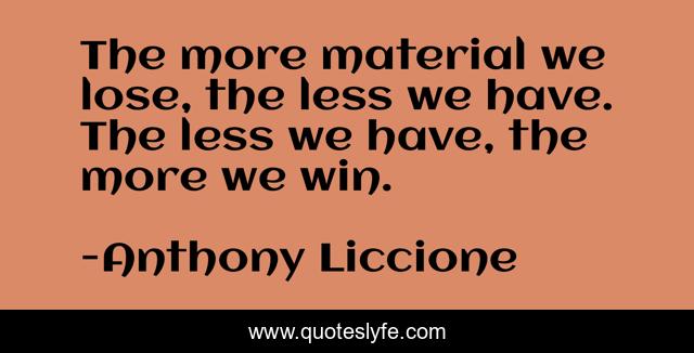 This page presents the quote "The more material we lose, the less we have. The less we have, the more we win.". Author of this quote is Anthony Liccione. This quote is about less, win, forfeit, being-content, happiness, possessions, things, needless, let-go,.