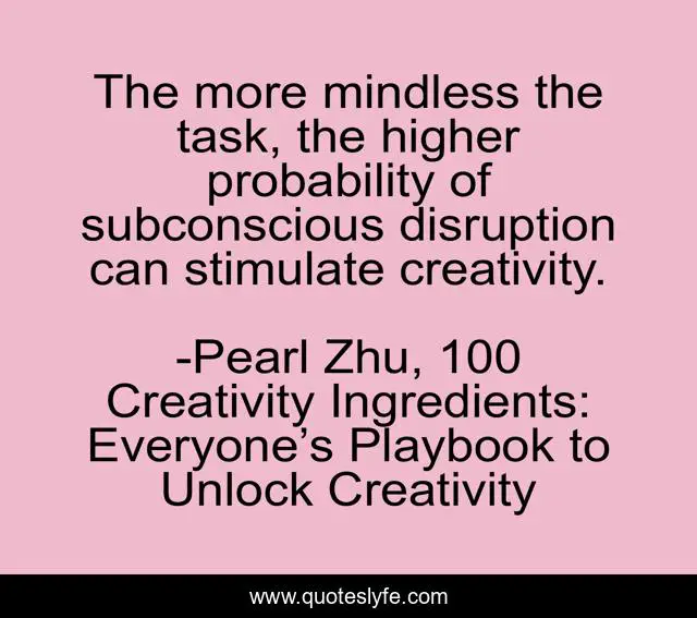 This page presents the quote "The more mindless the task, the higher probability of subconscious disruption can stimulate creativity.". Author of this quote is Pearl Zhu, 100 Creativity Ingredients: Everyone’s Playbook to Unlock Creativity. This quote is about creativity, subconscious-mind-power,.