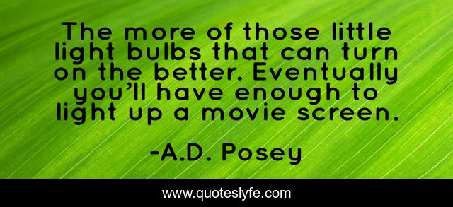 This page presents the quote "The more of those little light bulbs that can turn on the better. Eventually you’ll have enough to light up a movie screen.". Author of this quote is A.D. Posey. This quote is about story, storytelling, screen, stories, writing, write, light-up, writers, ad-posey,.