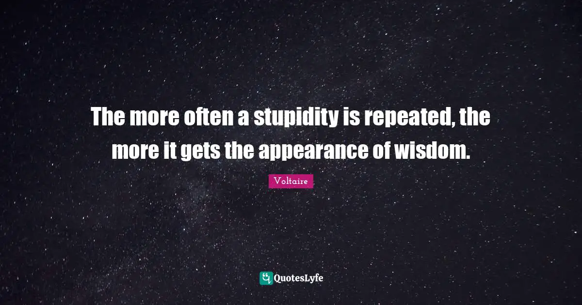 This page presents the quote "The more often a stupidity is repeated, the more it gets the appearance of wisdom.". Author of this quote is Voltaire. This quote is about stupidity, appearance, wisdom, ignorance,.