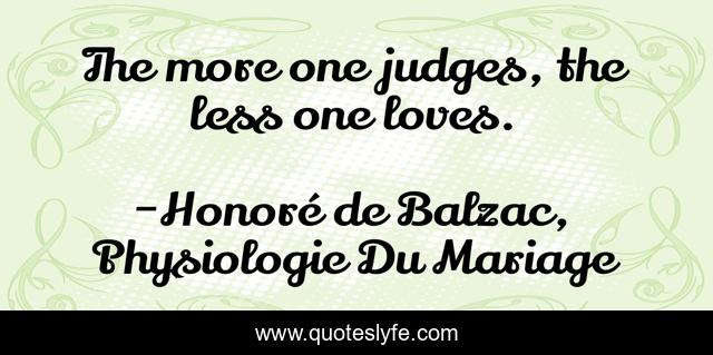 This page presents the quote "The more one judges, the less one loves.". Author of this quote is Honoré de Balzac, Physiologie Du Mariage. This quote is about human-nature, love, affection,.