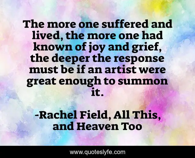 This page presents the quote "The more one suffered and lived, the more one had known of joy and grief, the deeper the response must be if an artist were great enough to summon it.". Author of this quote is Rachel Field, All This, and Heaven Too. This quote is about life, art, joy, grief, artists, life-and-living,.