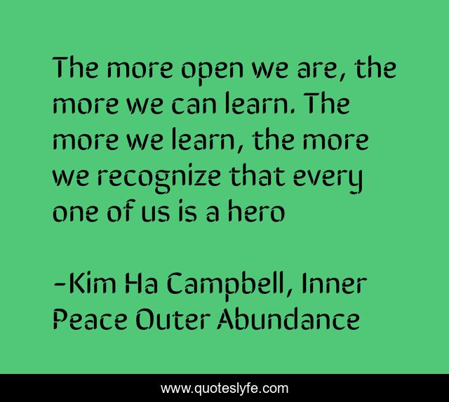 This page presents the quote "The more open we are, the more we can learn. The more we learn, the more we recognize that every one of us is a hero". Author of this quote is Kim Ha Campbell, Inner Peace Outer Abundance. This quote is about inner-peace-outer-abundance, hero, love, author, motivation, quotes, kim-ha-campbell, learning, growing,.