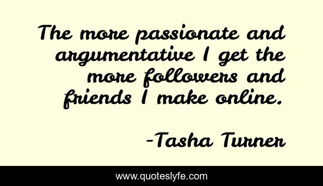 This page presents the quote "The more passionate and argumentative I get the more followers and friends I make online.". Author of this quote is Tasha Turner. This quote is about social-media, humor, weird,.