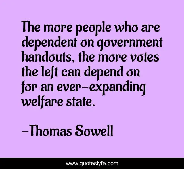 This page presents the quote "The more people who are dependent on government handouts, the more votes the left can depend on for an ever-expanding welfare state.". Author of this quote is Thomas Sowell. This quote is about left, people, welfare,.