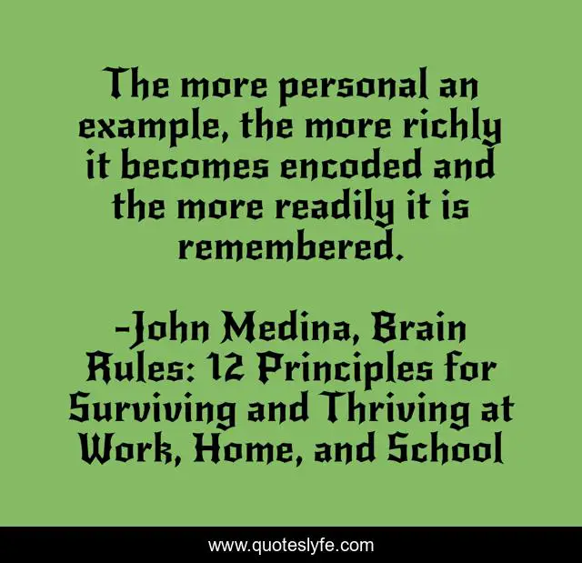 This page presents the quote "The more personal an example, the more richly it becomes encoded and the more readily it is remembered.". Author of this quote is John Medina, Brain Rules: 12 Principles for Surviving and Thriving at Work, Home, and School. .