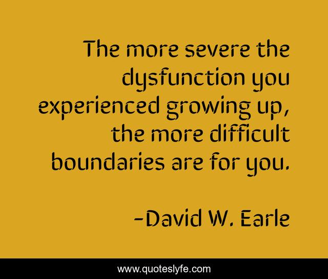 This page presents the quote "The more severe the dysfunction you experienced growing up, the more difficult boundaries are for you.". Author of this quote is David W. Earle. This quote is about love, recovery, family, communicatoin, chaos, boundaries, change, dysfunctional, affection,.