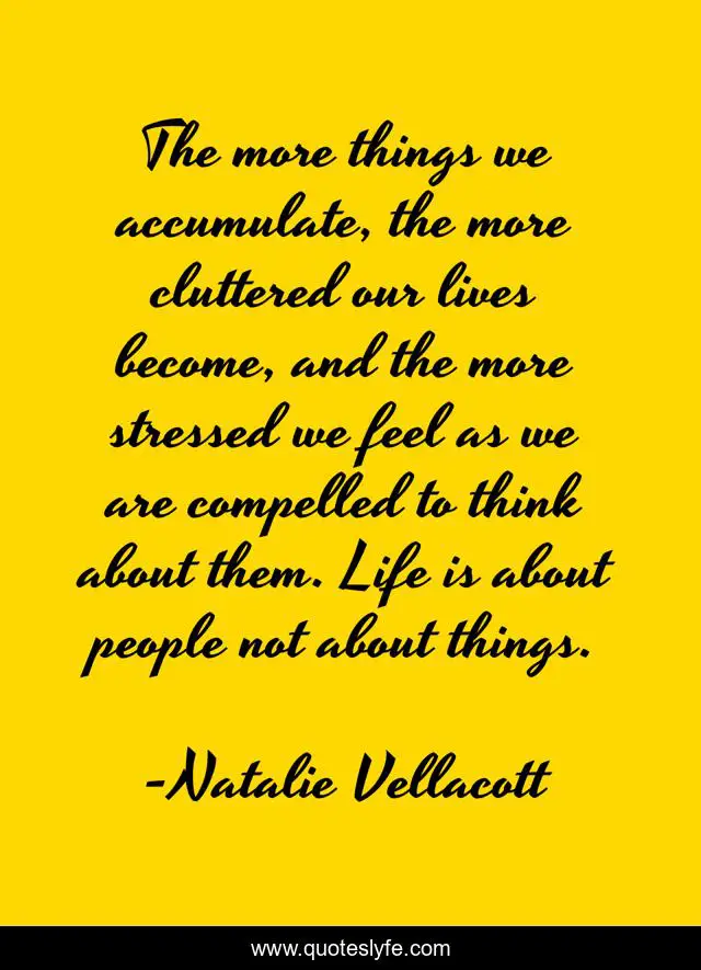 This page presents the quote "The more things we accumulate, the more cluttered our lives become, and the more stressed we feel as we are compelled to think about them. Life is about people not about things.". Author of this quote is Natalie Vellacott. This quote is about relationships, christianity, people, simple-living, materialism,.