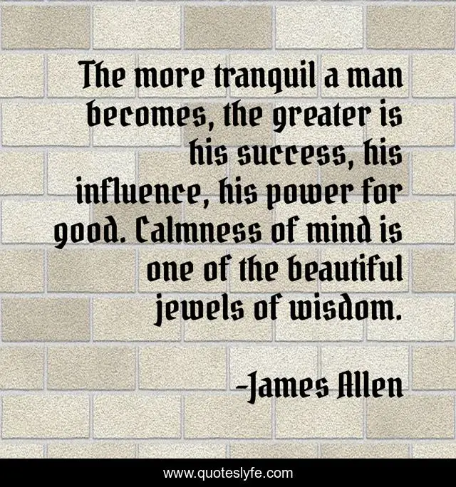 This page presents the quote "The more tranquil a man becomes, the greater is his success, his influence, his power for good. Calmness of mind is one of the beautiful jewels of wisdom.". Author of this quote is James Allen. This quote is about beautiful, success, wisdom,.