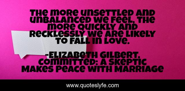 This page presents the quote "The more unsettled and unbalanced we feel, the more quickly and recklessly we are likely to fall in love.". Author of this quote is Elizabeth Gilbert, Committed: A Skeptic Makes Peace with Marriage. This quote is about escapism, love, emotions, affection,.