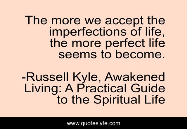 This page presents the quote "The more we accept the imperfections of life, the more perfect life seems to become.". Author of this quote is Russell Kyle, Awakened Living: A Practical Guide to the Spiritual Life. This quote is about life, acceptance, perfection,.
