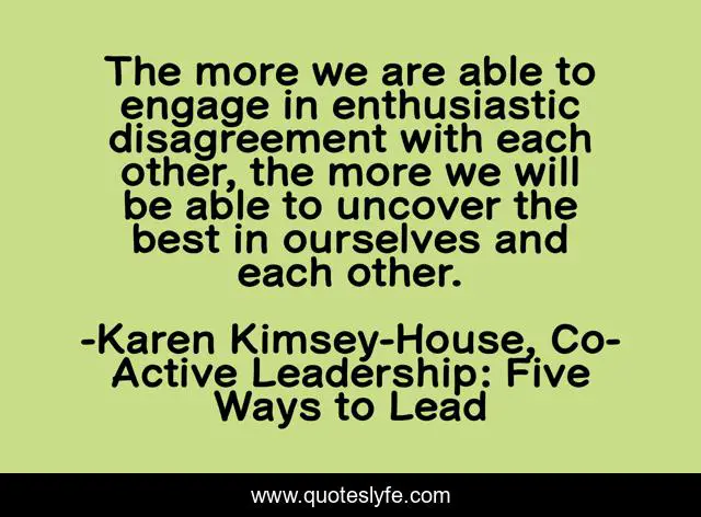 This page presents the quote "The more we are able to engage in enthusiastic disagreement with each other, the more we will be able to uncover the best in ourselves and each other.". Author of this quote is Karen Kimsey-House, Co-Active Leadership: Five Ways to Lead. This quote is about team-building, discussion, disagreement, enthusiastic, personal-growth,.