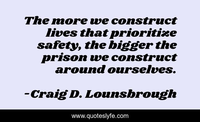 This page presents the quote "The more we construct lives that prioritize safety, the bigger the prison we construct around ourselves.". Author of this quote is Craig D. Lounsbrough. This quote is about living, imprisonment, risk, fearful, prioritize, create, safe, construct, stability,.