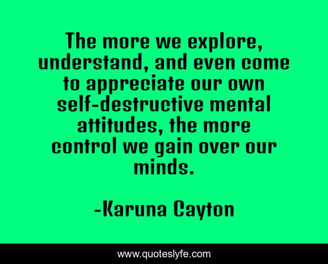 This page presents the quote "The more we explore, understand, and even come to appreciate our own self-destructive mental attitudes, the more control we gain over our minds.". Author of this quote is Karuna Cayton. This quote is about buddhism, mind-power, psychology,.