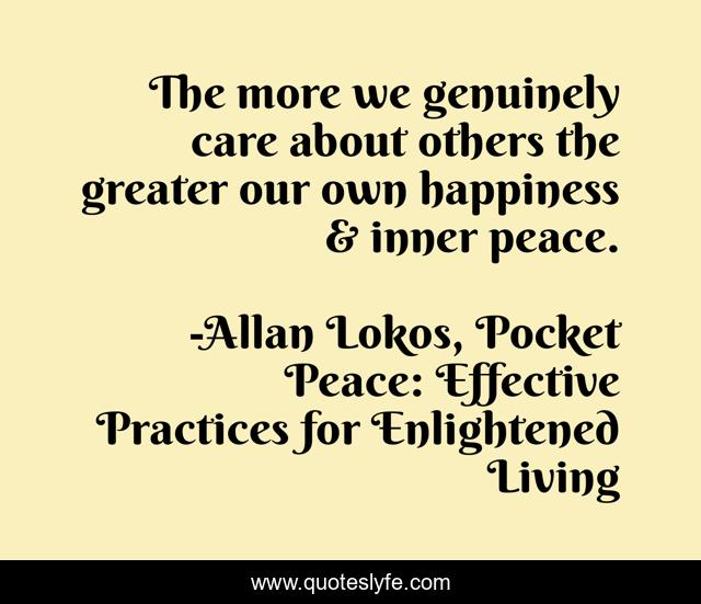 This page presents the quote "The more we genuinely care about others the greater our own happiness & inner peace.". Author of this quote is Allan Lokos, Pocket Peace: Effective Practices for Enlightened Living. This quote is about compassion, peace, lovingkindness, buddhism, inspirational, enthusiasm, meditation,.