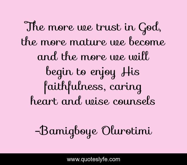 This page presents the quote "The more we trust in God, the more mature we become and the more we will begin to enjoy His faithfulness, caring heart and wise counsels". Author of this quote is Bamigboye Olurotimi. This quote is about enjoy, life, faithfulness, caring-heart, god, mature, wise-counsel, trust,.