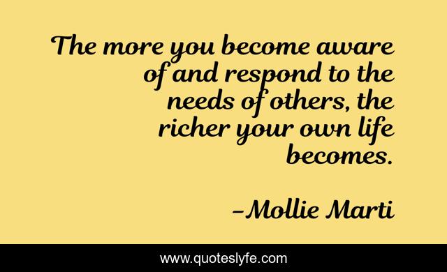 This page presents the quote "The more you become aware of and respond to the needs of others, the richer your own life becomes.". Author of this quote is Mollie Marti. This quote is about mentorship, service, leadership, inspiration,.