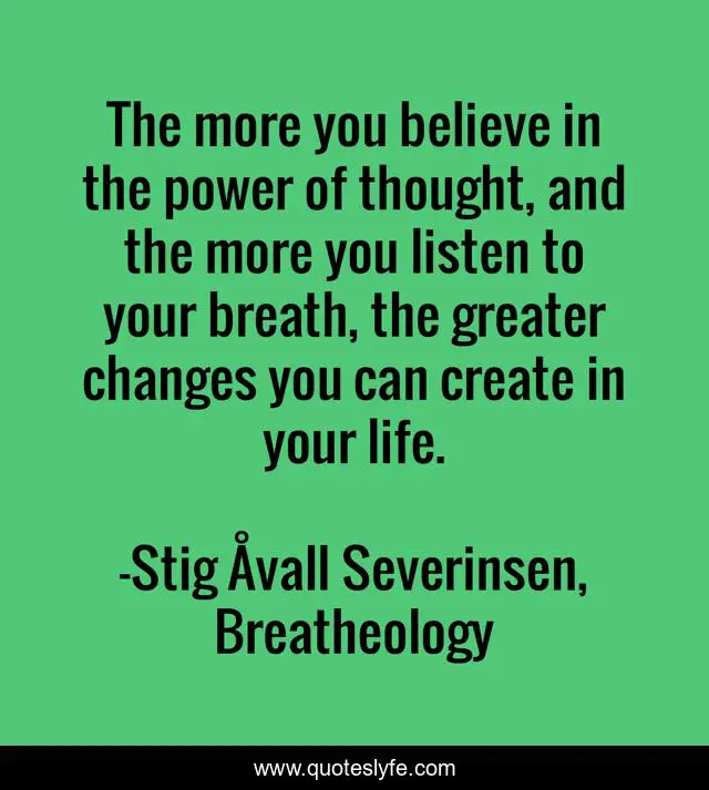 This page presents the quote "The more you believe in the power of thought, and the more you listen to your breath, the greater changes you can create in your life.". Author of this quote is Stig Åvall Severinsen, Breatheology. This quote is about breath, breatheology, changes, thought,.