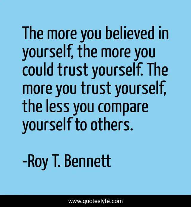 This page presents the quote "The more you believed in yourself, the more you could trust yourself. The more you trust yourself, the less you compare yourself to others.". Author of this quote is Roy T. Bennett. This quote is about living, inspiring, inspire, believe-in-yourself, positive-affirmation, motivational, life, confidence, optimism,.