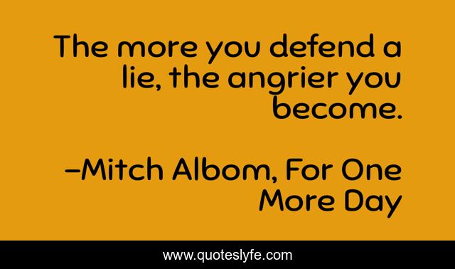 This page presents the quote "The more you defend a lie, the angrier you become.". Author of this quote is Mitch Albom, For One More Day. .