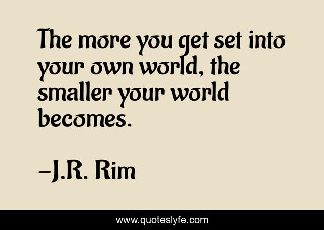This page presents the quote "The more you get set into your own world, the smaller your world becomes.". Author of this quote is J.R. Rim. This quote is about perspective, perception, think-big, worldview, variety, self, own-life, own-way, daily,.