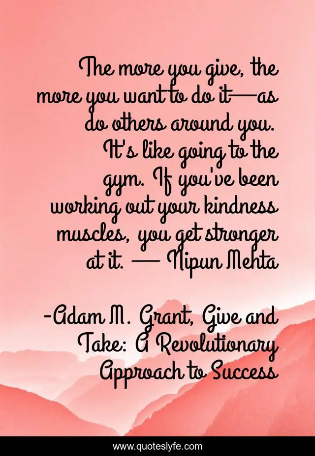 This page presents the quote "The more you give, the more you want to do it—as do others around you. It's like going to the gym. If you've been working out your kindness muscles, you get stronger at it. — Nipun Mehta". Author of this quote is Adam M. Grant, Give and Take: A Revolutionary Approach to Success. This quote is about inspirational-attitude, enthusiasm, inspirational,.