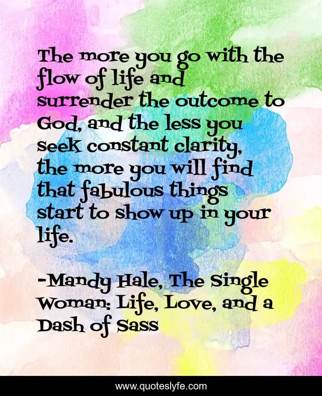 This page presents the quote "The more you go with the flow of life and surrender the outcome to God, and the less you seek constant clarity, the more you will find that fabulous things start to show up in your life.". Author of this quote is Mandy Hale, The Single Woman: Life, Love, and a Dash of Sass. This quote is about faith, life, trust, letting-go, god, the-unknown, positive-thinking, clarity, attraction,.