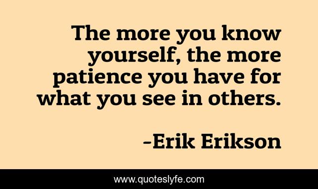 This page presents the quote "The more you know yourself, the more patience you have for what you see in others.". Author of this quote is Erik Erikson. This quote is about know yourself, yourself,.