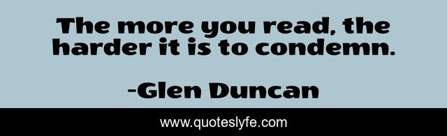 This page presents the quote "The more you read, the harder it is to condemn.". Author of this quote is Glen Duncan. This quote is about judgement, reading, reasoning, words-of-wisdom, wisdom,.