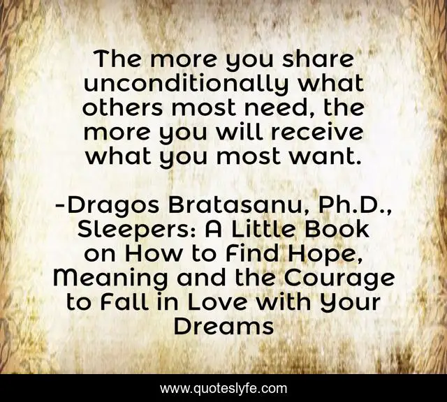 "Dragos Bratasanu, Ph.D., Sleepers: A Little Book on How to Find Hope, Meaning and the Courage to Fall in Love with Your Dreams Quotes." Quoteslyfe.com, 2025. Fri. 05 Dec. 2025. <https://www.quoteslyfe.com/quote/The-more-you-share-unconditionally-what-others-188002>.