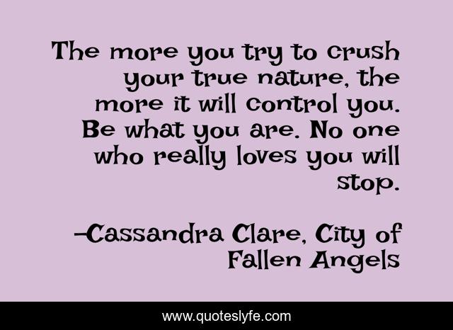 This page presents the quote "The more you try to crush your true nature, the more it will control you. Be what you are. No one who really loves you will stop.". Author of this quote is Cassandra Clare, City of Fallen Angels. This quote is about be-yourself, mortal-instruments, simon-lewis, luke-garroway,.
