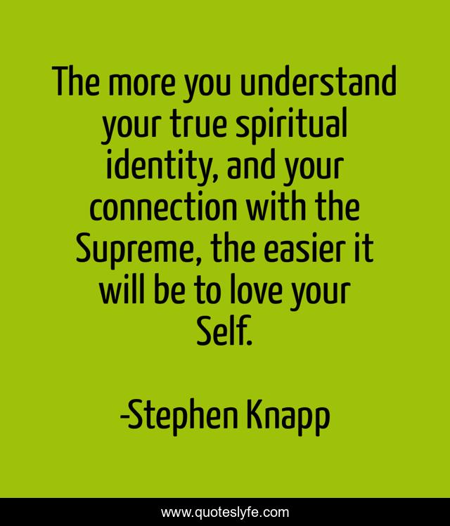 This page presents the quote "The more you understand your true spiritual identity, and your connection with the Supreme, the easier it will be to love your Self.". Author of this quote is Stephen Knapp. .