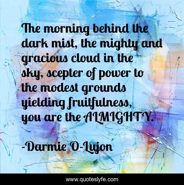 This page presents the quote "The morning behind the dark mist, the mighty and gracious cloud in the sky, scepter of power to the modest grounds yielding fruitfulness, you are the ALMIGHTY.". Author of this quote is Darmie O-Lujon. This quote is about omnipotent, power, creator,.