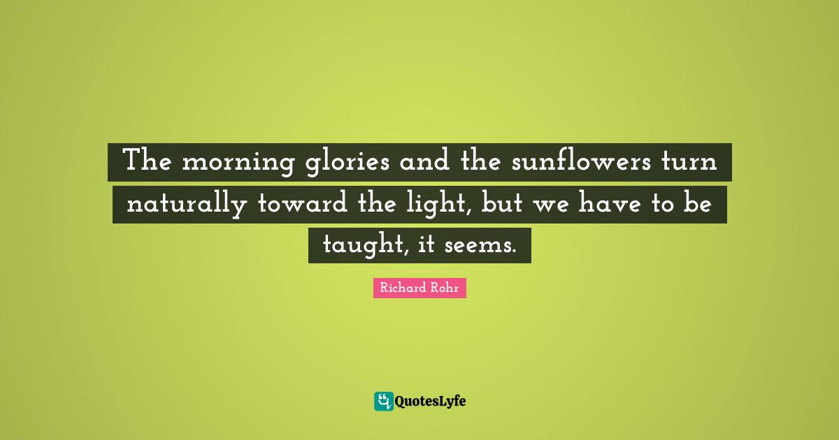 This page presents the quote "The morning glories and the sunflowers turn naturally toward the light, but we have to be taught, it seems.". Author of this quote is Richard Rohr. This quote is about light, sunflower, morning, seems, taught,.