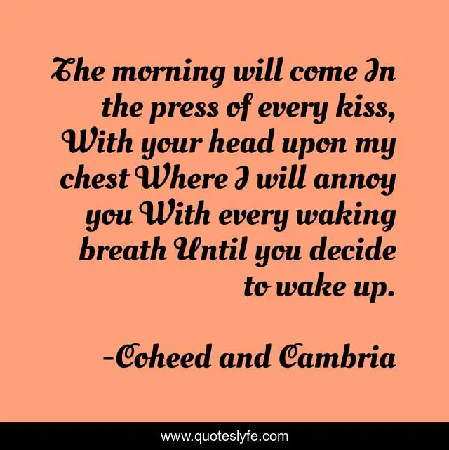 This page presents the quote "The morning will come In the press of every kiss, With your head upon my chest Where I will annoy you With every waking breath Until you decide to wake up.". Author of this quote is Coheed and Cambria. This quote is about romance, love, affection,.