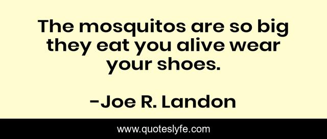 This page presents the quote "The mosquitos are so big they eat you alive wear your shoes.". Author of this quote is Joe R. Landon. This quote is about mystery, suspense,.