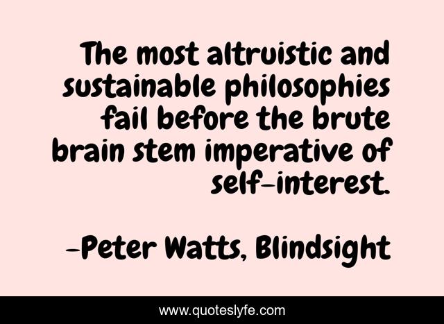 This page presents the quote "The most altruistic and sustainable philosophies fail before the brute brain stem imperative of self-interest.". Author of this quote is Peter Watts, Blindsight. This quote is about life-philosophy, altruism, self-interest, brutality,.
