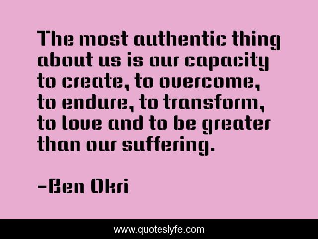 This page presents the quote "The most authentic thing about us is our capacity to create, to overcome, to endure, to transform, to love and to be greater than our suffering.". Author of this quote is Ben Okri. This quote is about life, human,.