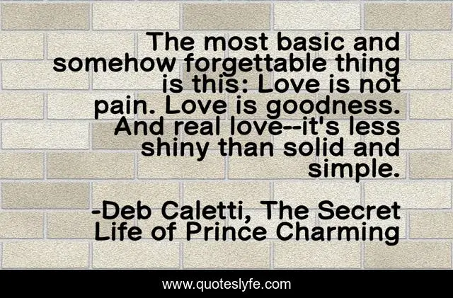 This page presents the quote "The most basic and somehow forgettable thing is this: Love is not pain. Love is goodness. And real love--it's less shiny than solid and simple.". Author of this quote is Deb Caletti, The Secret Life of Prince Charming. This quote is about real, pain, simple, forgettable, solid, goodness, basic, love, shiny,.