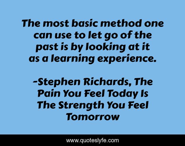 This page presents the quote "The most basic method one can use to let go of the past is by looking at it as a learning experience.". Author of this quote is Stephen Richards, The Pain You Feel Today Is The Strength You Feel Tomorrow. This quote is about empowering, confidence, moving-on-and-letting-go, healing-the-past, motivational, forgive, stephen-richards-author, stephen-richards, suffering,.