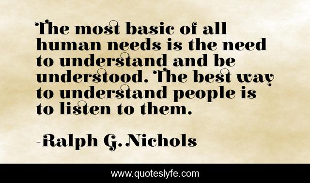 This page presents the quote "The most basic of all human needs is the need to understand and be understood. The best way to understand people is to listen to them.". Author of this quote is Ralph G. Nichols. This quote is about listening, understanding,.