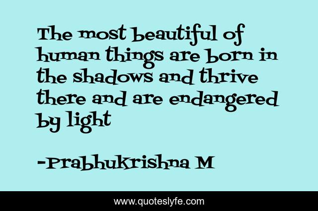 This page presents the quote "The most beautiful of human things are born in the shadows and thrive there and are endangered by light". Author of this quote is Prabhukrishna M. This quote is about endangered, shadow, humanity, beauty, light,.