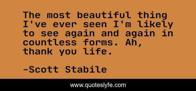 This page presents the quote "The most beautiful thing I've ever seen I'm likely to see again and again in countless forms. Ah, thank you life.". Author of this quote is Scott Stabile. This quote is about life, love, beauty, affection, inspiration,.