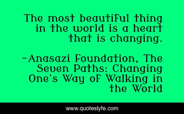 This page presents the quote "The most beautiful thing in the world is a heart that is changing.". Author of this quote is Anasazi Foundation, The Seven Paths: Changing One's Way of Walking in the World. This quote is about lara-ackerman, anasazi-foundation, mother-earth, change-of-heart, nature, native-american, wisdom, healing, native-american-wisdom,.