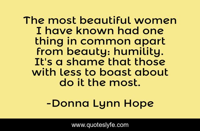 This page presents the quote "The most beautiful women I have known had one thing in common apart from beauty: humility. It's a shame that those with less to boast about do it the most.". Author of this quote is Donna Lynn Hope. This quote is about boasting, beauty, humble, bragging, ego, humility,.