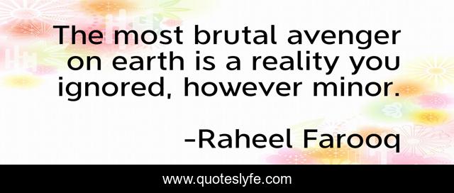 This page presents the quote "The most brutal avenger on earth is a reality you ignored, however minor.". Author of this quote is Raheel Farooq. This quote is about life, revenge, reality,.