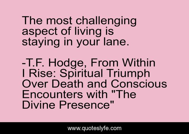 This page presents the quote "The most challenging aspect of living is staying in your lane.". Author of this quote is T.F. Hodge, From Within I Rise: Spiritual Triumph Over Death and Conscious Encounters with "The Divine Presence". This quote is about living, life, challenging, challenge, focus, experience, focused,.