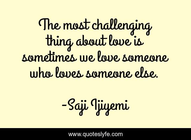 This page presents the quote "The most challenging thing about love is sometimes we love someone who loves someone else.". Author of this quote is Saji Ijiyemi. This quote is about lovers, love, love-and-sayings, love-story, love-hurts, affection,.