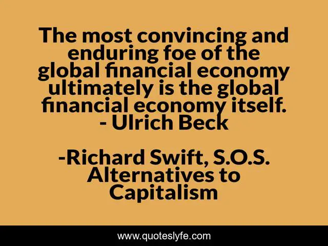 This page presents the quote "The most convincing and enduring foe of the global financial economy ultimately is the global financial economy itself. - Ulrich Beck". Author of this quote is Richard Swift, S.O.S. Alternatives to Capitalism. This quote is about global, inequality, finance, capitalism, economy,.