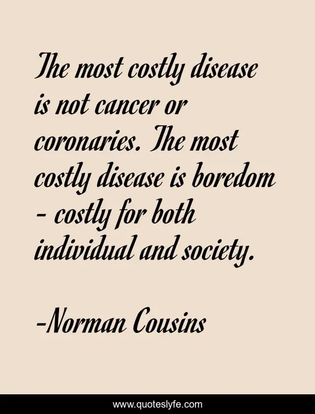 This page presents the quote "The most costly disease is not cancer or coronaries. The most costly disease is boredom - costly for both individual and society.". Author of this quote is Norman Cousins. This quote is about bores, boredom,.